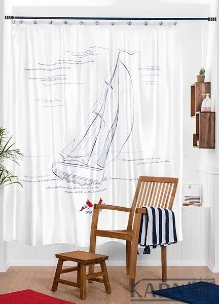 Занавеска из 100% полиэстера для ванны с 12 металлическими люверсами под кольца. Материал шторы обработан гидрофобной пропиткой, отталкивающей воду. Внизу по всей длине вшит шнур-утяжелитель.